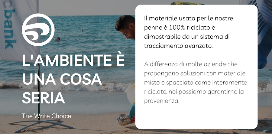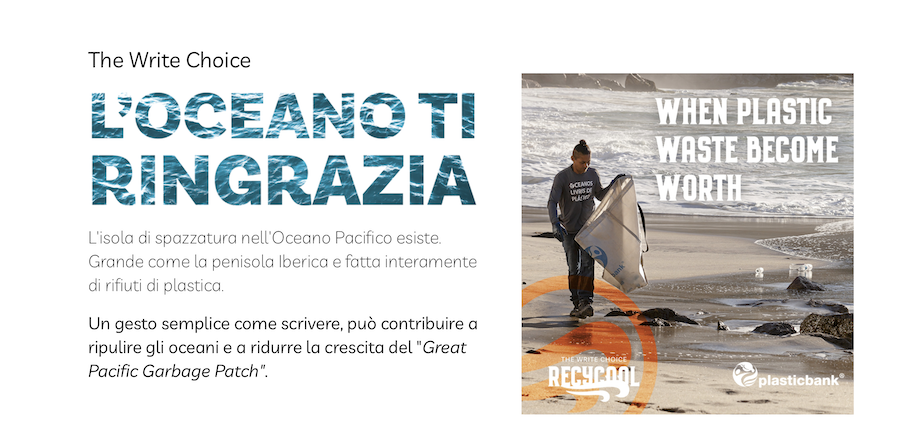 Penna Revolution Ocean: alta qualità, plastiche riciclate dall’oceano, produzione 100% italiana, certificata e personalizzabile su fusto e clip.